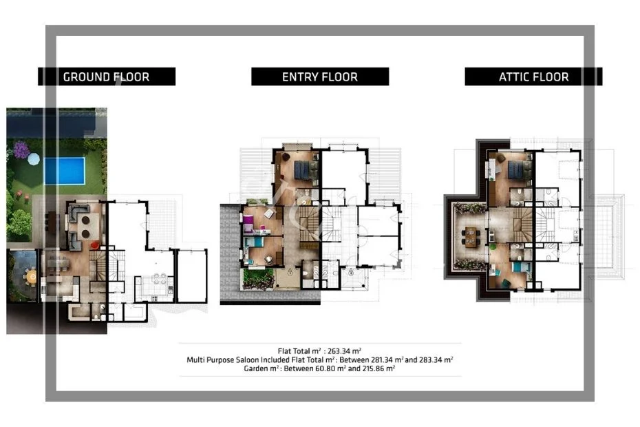 توفر هذه المخططات لمحة عامة عن تصميم الفيلا الخارجي على مستوى الطابق الأرضي، بما يتضمن المساحات الخارجية والشرفات والمسابح والحدائق.